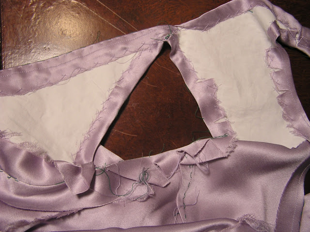 As I showed in my previous post, I thread-traced the seam allowances, so the seams were sewn by carefully aligning the seamlines. Once the seam was sewn, I removed the tracing thread. There was a bit of tricky sewing inserting a gore into part of the skirt, but luckily I pretty much got it right on the first try. My silk is actually sturdy enough that unpicking is not a disaster. In addition to using twill tape to shape and support the back neckline, I made a back stay out of a shirting cotton to reinforce the straps. They are quite narrow, but they support the entire weight of the dress, so I felt they could use some extra support. (Ordinarily, I could add extra support using a waist stay, but the low back precludes this.)