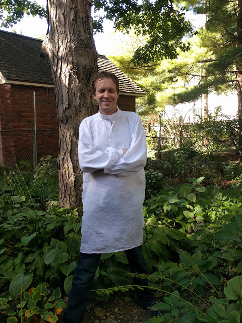 My shift (and Wade’s shirt) is fairly accurate in that it is made from linen. Constructing the shift and the shirt definitely felt different from constructing a modern garment. All of the pieces were either rectangles or triangles, with the exception of the neckline. They were cut this way to make the most economical use of the fabric. I have read posts from some historical costumers who hand sew their shifts, and they impress me with their dedication, but there was no way I was doing that. I used my machine, but did use felled seams for all the main seams. I was seriously temped to serge the arm gussets, but it just felt wrong on such a historical-feeling pattern. Instead, I cut a second gusset piece and handstitched it over. I have no idea if it was ever done like that, but I couldn’t leave all those raw edges.