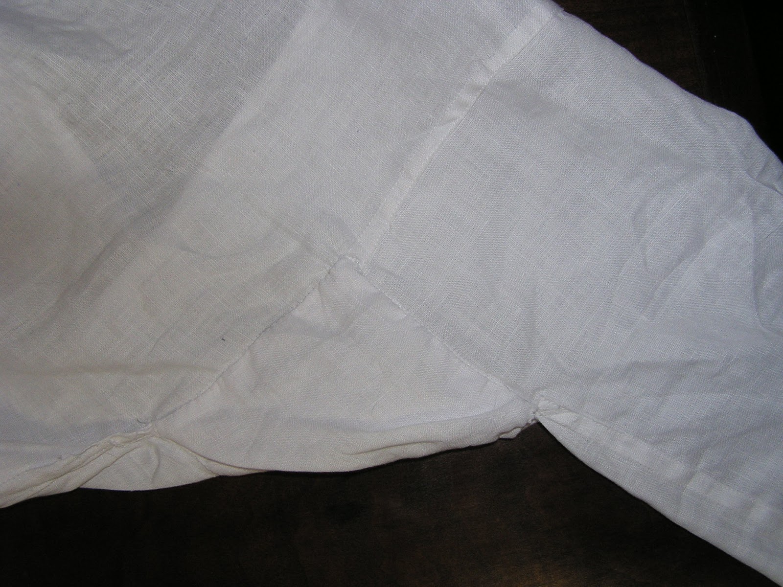 In keeping with the historical theme, I’m making all of the necessary underpinnings. The first of these is of course the shift. In this time period, the shift was the first layer. Shifts were made of linen, as cotton was generally very expensive or unavailable. Shifts were worn by people of all classes, with the rich using finer linen than the lower classes. Since the outer dress would not have been washed very frequently, one job of the shift was to provide a layer between the body and the outer garment. For men, the equilvalant of the shift was the shirt, which was actually a very similar garment. The shirt has a collar, longer sleeves, and is shorter, while the shift is longer and has gores to make a wider skirt. But overall their shape was very similar, and they had the same function.