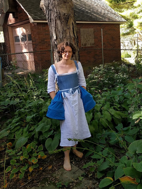 To finish the stays, the edges must be bound. I opted not to use my blue silk because I thought a contrast border would be cute. Afterwards, I realized that my choice may have been influenced by the model cover photo on the pattern. I did not want to waste my linen making binding, so instead I used some white quilting cotton that I had lying around. I quickly learned that binding all those little tabs on 18th century stays is a pain in the ass. I first tried using my machine, but quickly learned that was impossible. I was able to attach the binding to the straighter parts by machine, which I then finished by slipstitching. The tabs, however, I had to stitch entirely by hand; first using a running stitch to attach the binding, then finishing with the slipstitching. I am not used to doing that much handsewing, and I was contending with 4 layers of fabric. When I finally finished, my hands were sore for several days afterwards. The inside of the binding is not perfectly smooth, but I am just glad it is done. I am pretty happy with my stays aside from the size. I made a mock-up in posterboard as suggested by the pattern, but it proved hard to fit. The overall fit of my stays is actually pretty good, but instead of have a two inch gap in the back, it has to be laced all the way down. This seems to be a pattern with me and corsets.