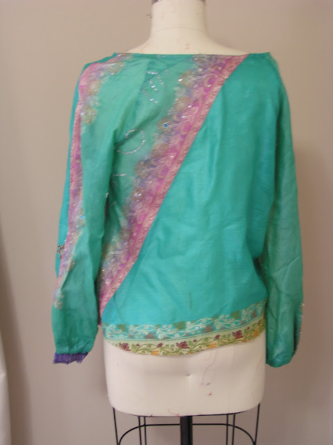 The sari I picked was mostly green, but the contrast area (called the pallu, I believe) is pink and has a woven pattern. I used that for the yoke and also for the area near the split. I had to do a bit of piecing to get it on both sides, but I think that effect works.